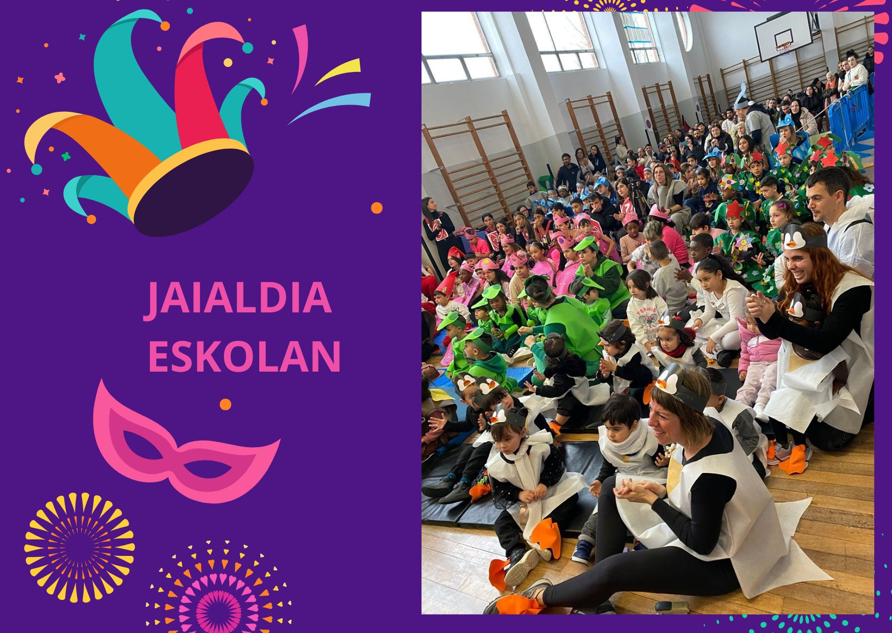Eguraldiak asko lagundu ez bazigun ere, aurten ere inauteriak ospatu genituen Elejabarrin. Eguna ondo asteko, patioan bertan danborrada bat egin genuen. Gure ikasle nagusienak danborra jotzen ibili ziren eta; besteak, dantzan. Horren ostean, gela bakoitzak hainbat astetan prestatutako dantza, abestia… eskaini zigun. Aurten eszenatoki berria izan genuen eta primeran irten zen! Amaitzeko, denok batera, jantokian bazkaldu genuen.