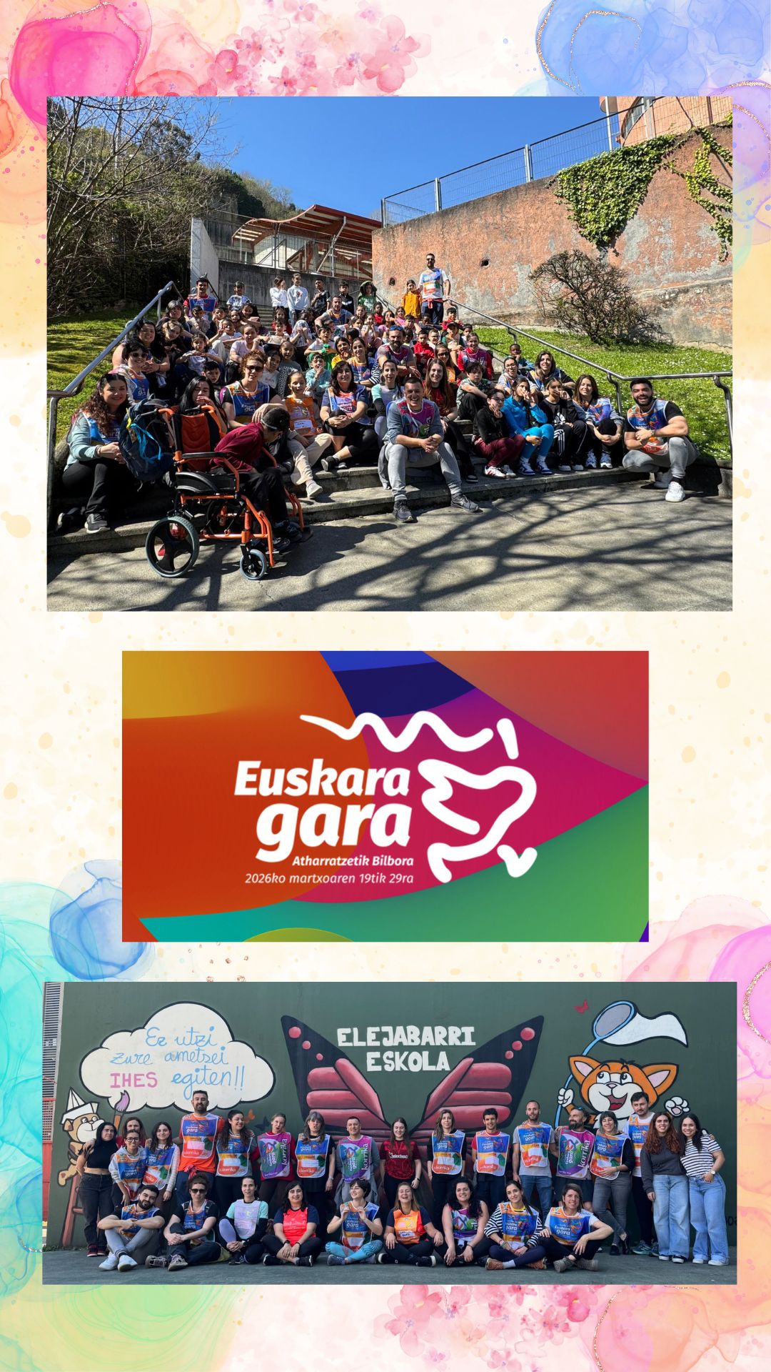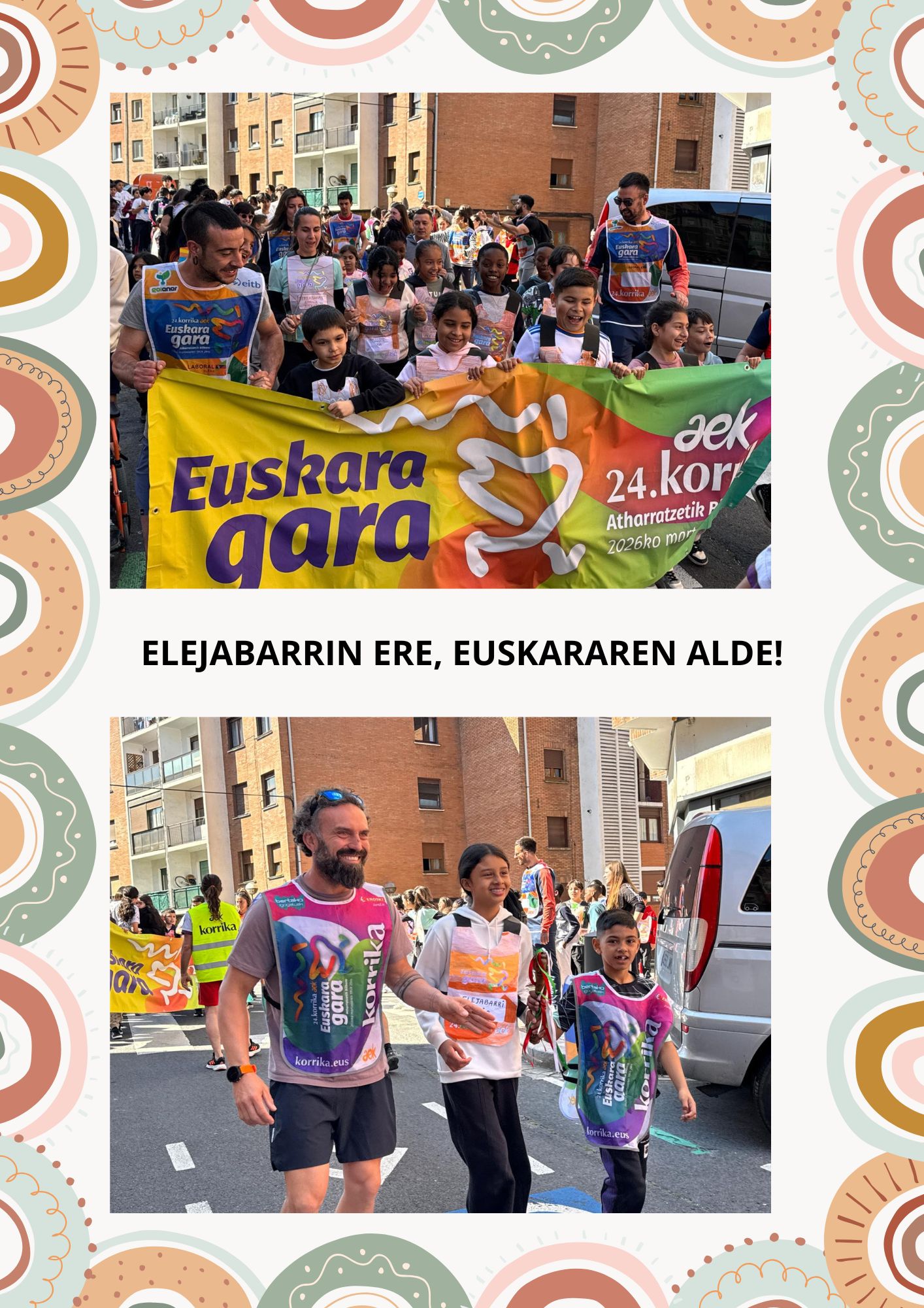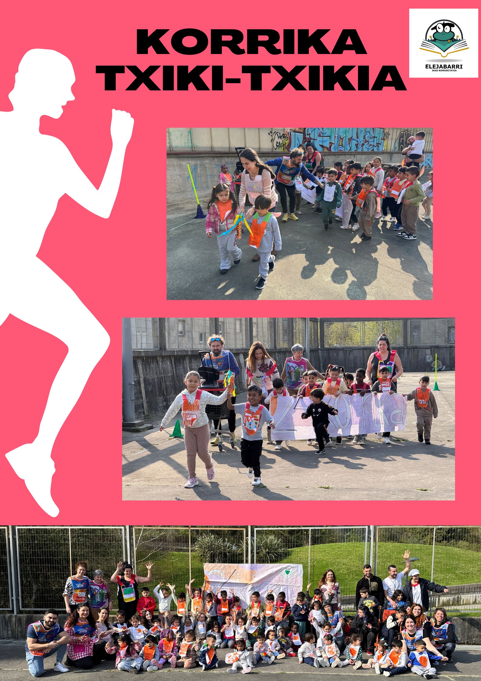 Gure ikas komunitatean oso gogotsu egon gara korrikaren zain. Aurreko asteartean, martxoaren 24an gure auzoko korrika txikian parte hartzeko aukera izan genuan eta inguruko beste eskolekin batera auzoa euskaraz bete genuen! LIP gelako eta Lehen Hezkuntzako ikasleok parte hartu genuen horetan; baina ez pentsa HHkoek korrika egiteko aukera galdu zutenik! HH-n ere korrika txiki-txikia antolatu genuen gure eskolako patioan eta oso momentu polita izan zen!
